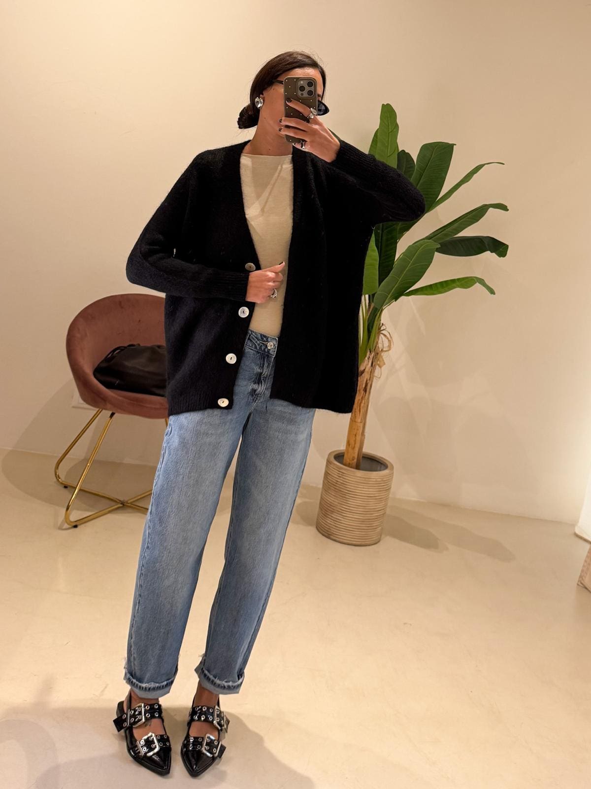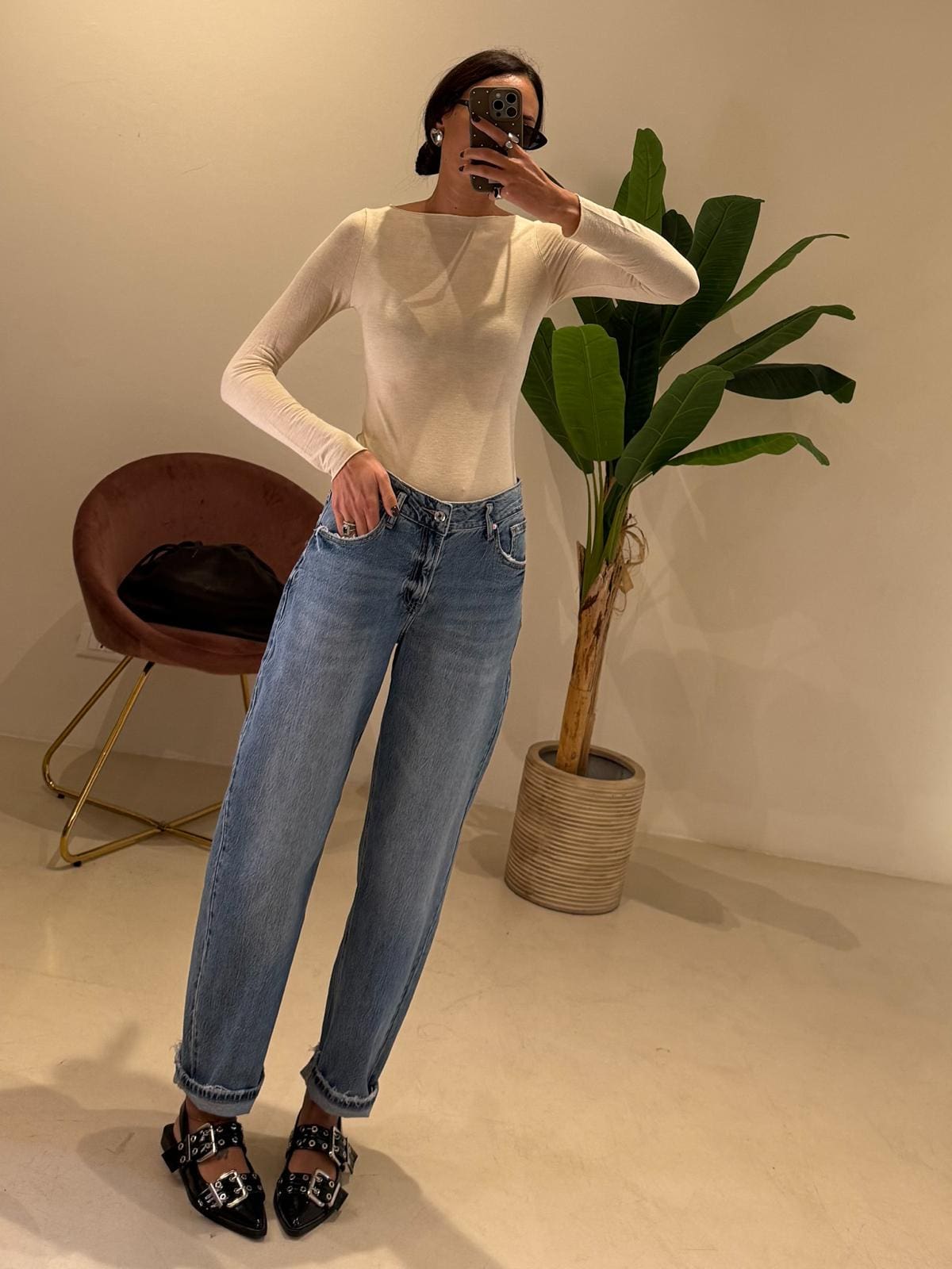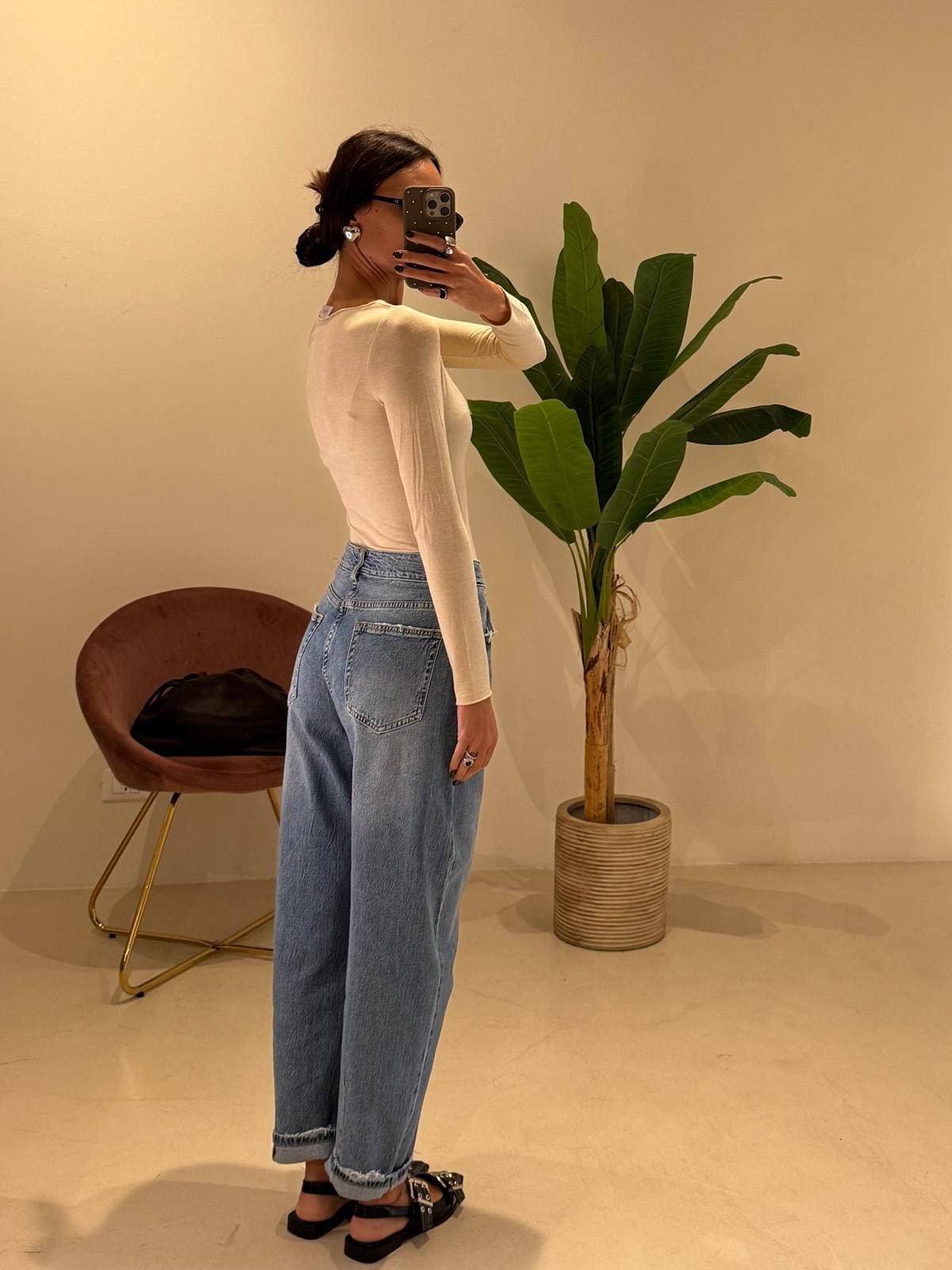 Lavaggio chiaro Modello Ballon Sofia h 173cm indossa taglai S per ottenere piu un fit morbido