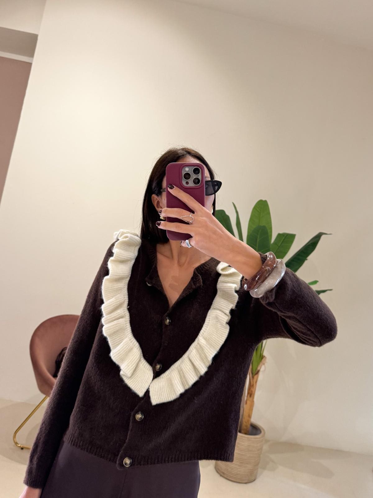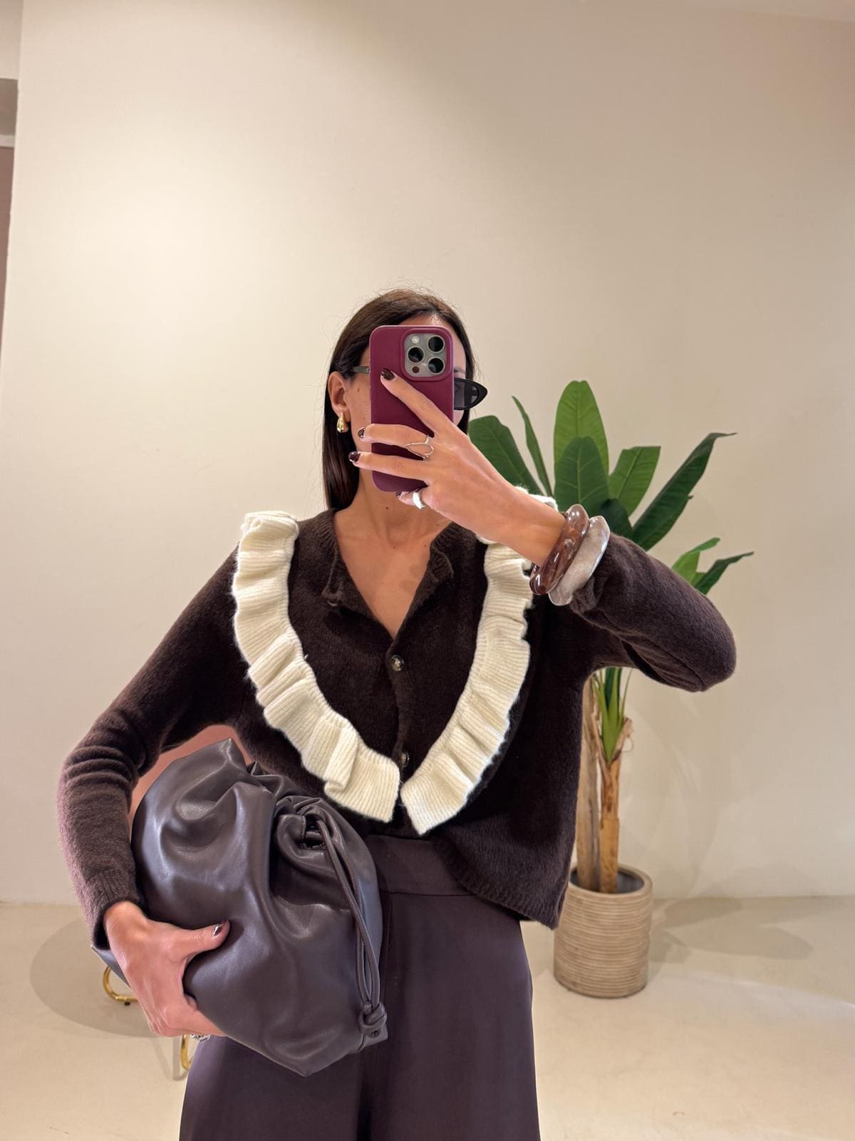 Base marrone con galetta burro Composizione: 28% polyestere 10% lana 6 % alpaca 6% viscosa 2 elasthan Veste da S a L